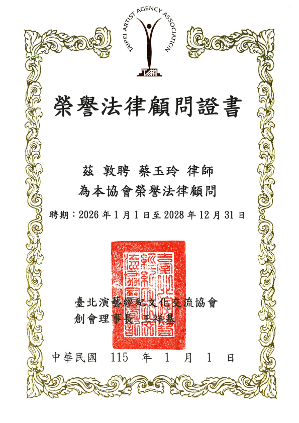 [Public Interest Works] Jaclyn Tsai has been appointed as an Honorary Legal Advisor to the Taipei Artist Agency Association, starting from January 1, 2026 to December 31, 2028.